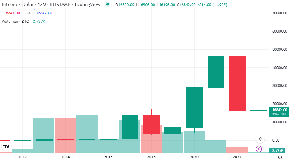 Poniższy wykres pokazuje, że po roku spadków następuje trzyletnie odreagowanie, kiedy to cena Bitcoina systematycznie idzie w górę. Tak było po 2014 i 2018 roku. Czy tendencja zostanie podtrzymana i po spadkowym 2022 roku czeka nas kolejna hossa? (na czerwono zaznaczone są spadki, a zielono – wzrosty)